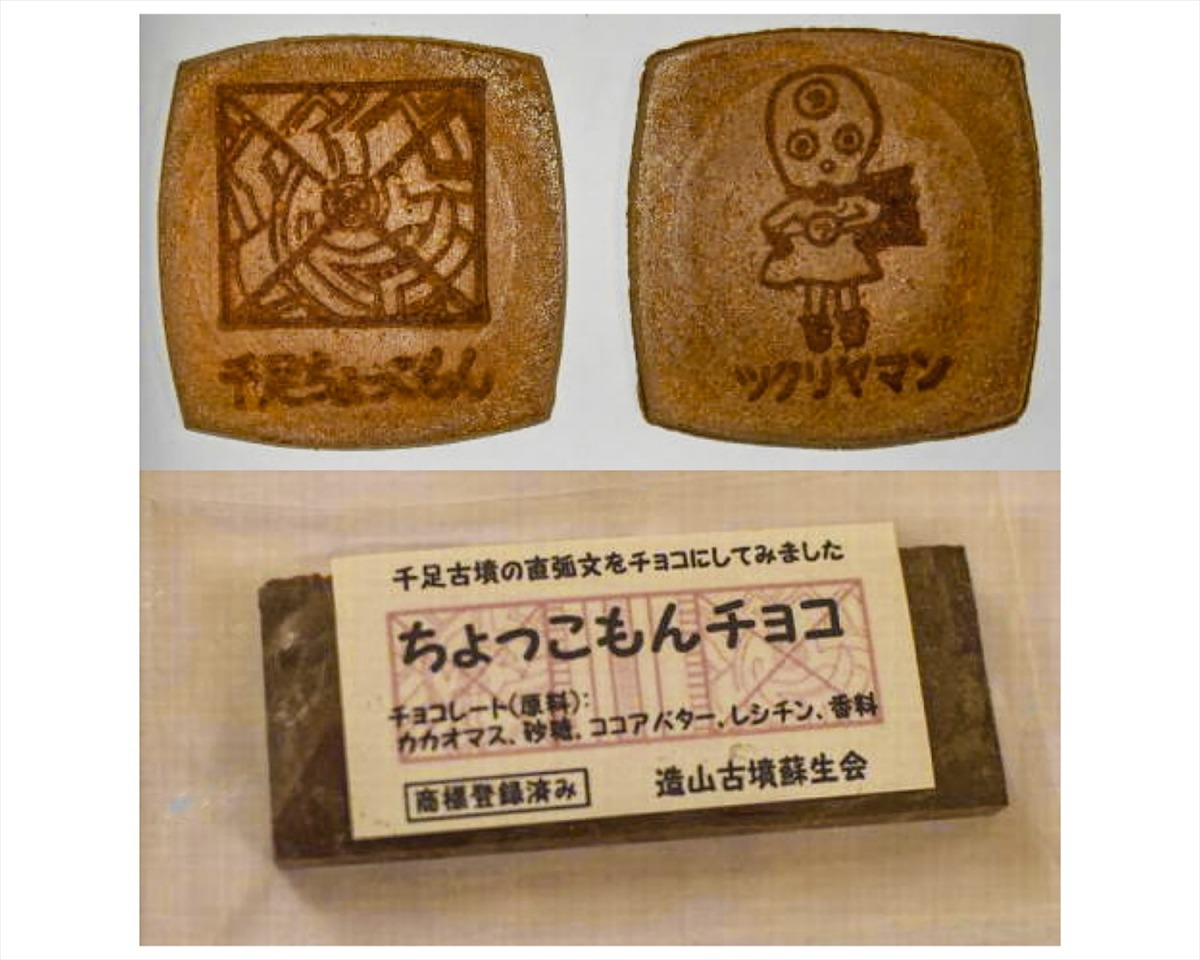 造山古墳蘇生会で販売している古墳せんべい(写真上)とちょっこもんチョコ(写真下)です。