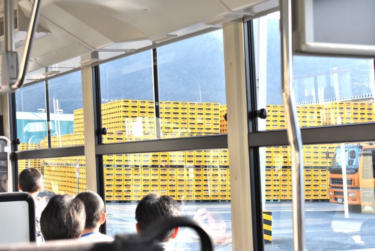 ビールケース山をかき分けてバスで移動!
