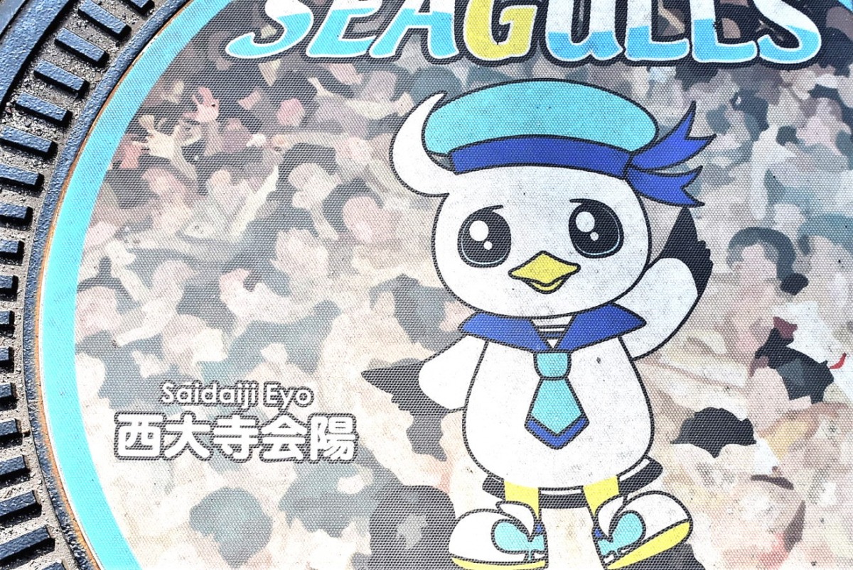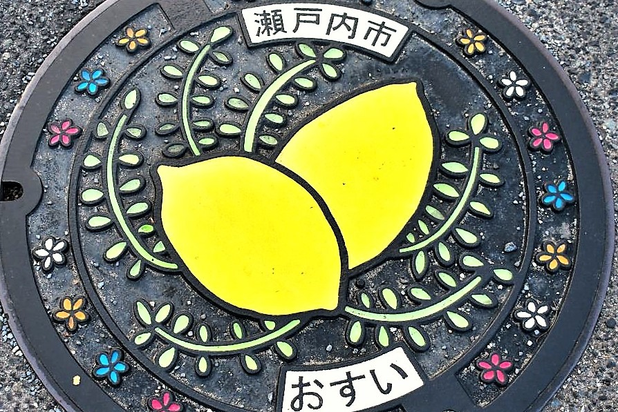 オリーブの葉に小花もあしらった瀬戸内市のかわいいマンホールは、なんと地元中学生のデザイン!マンホールの黒にレモンの黄色がひと際よく映えています。2017年夏よりマンホールカードになっています(第5弾)。