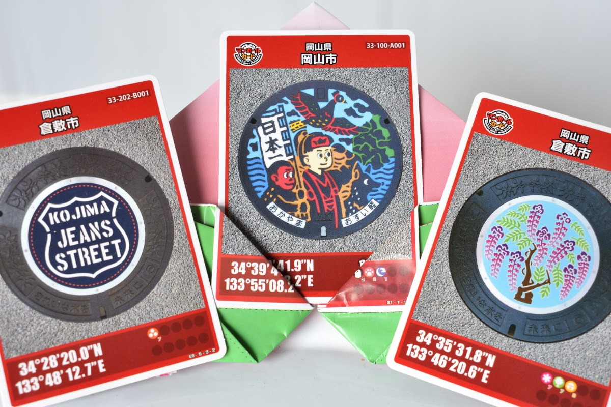 岡山県内でゲット出来るマンホールカードは2018年2月現在では7種類あり、もちろん無料です。桃太郎バージョンを配布している「ももたろう観光センター」(岡山市北区駅元町一番街)では、折って作ると桃のカタチになるかわいいマンホールカード入れももらえます。旅の楽しみが増えそうです。