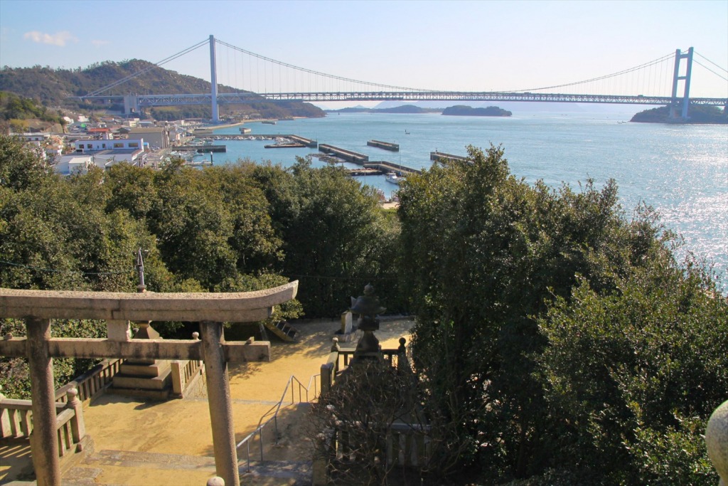 北前船の寄港地として下津井港が栄えた江戸時代後半頃に祀られた、海抜22mの小高い岬にある神社です。境内からは瀬戸大橋と瀬戸内海、下津井地区が一望できます。