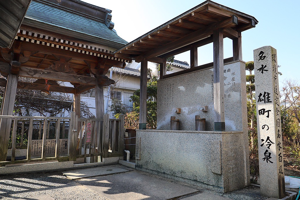 岡山市内を流れる旭川の伏流水が湧出したもので、1686年に池田綱政によって作られ、岡山藩池田家の御用水として使われていました。現在、雄町の冷泉からは水をくむ事ができませんが、近くに水くみ場などを備えた公園、おまちアクアガーデンが整備されています。