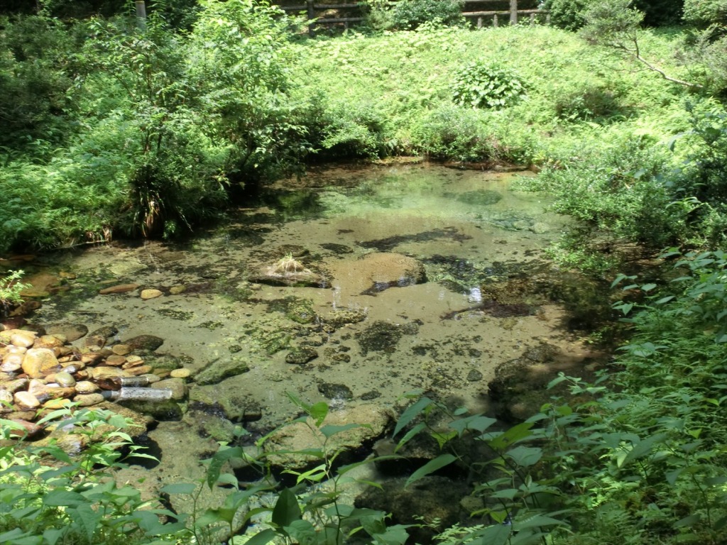蒜山三座の真ん中、中蒜山の裾の谷間から湧き出ている冷泉です。湧水は東西12m、南北5m、面積約60m2のひょうたん池を形成し、最深部は1.9m、湧水量は毎秒300リットル。水温は年中10度前後に保たれています。