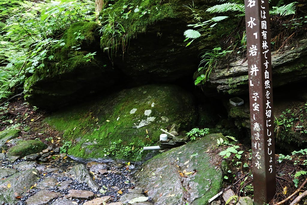 裏見の滝として有名な岩井滝から100mふもとに湧き出る名水です。この水を21日間飲み続け7月10日に念願の子を授かったという伝説があることから、「子宝の水」とも呼ばれています。毎年7月10日には岩井滝まつりとして、多くの人が水を汲みに訪れます。