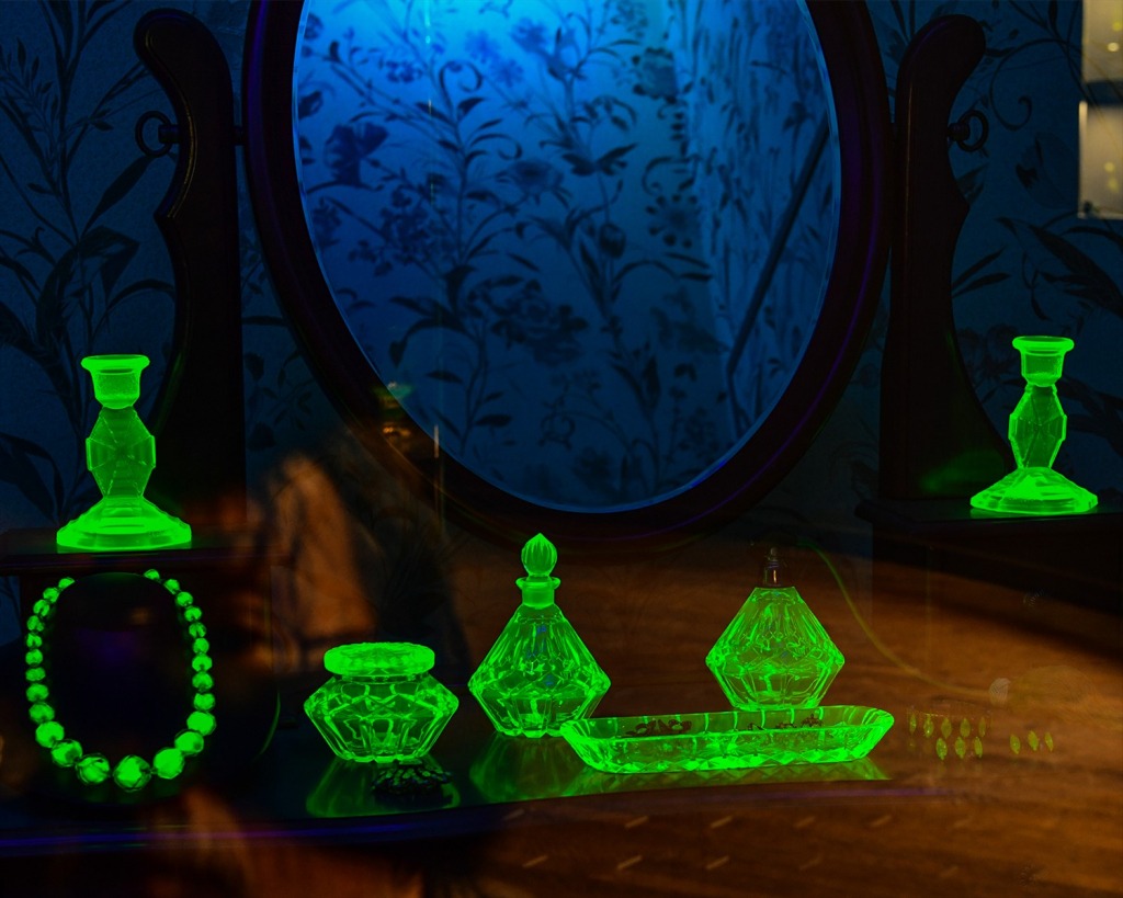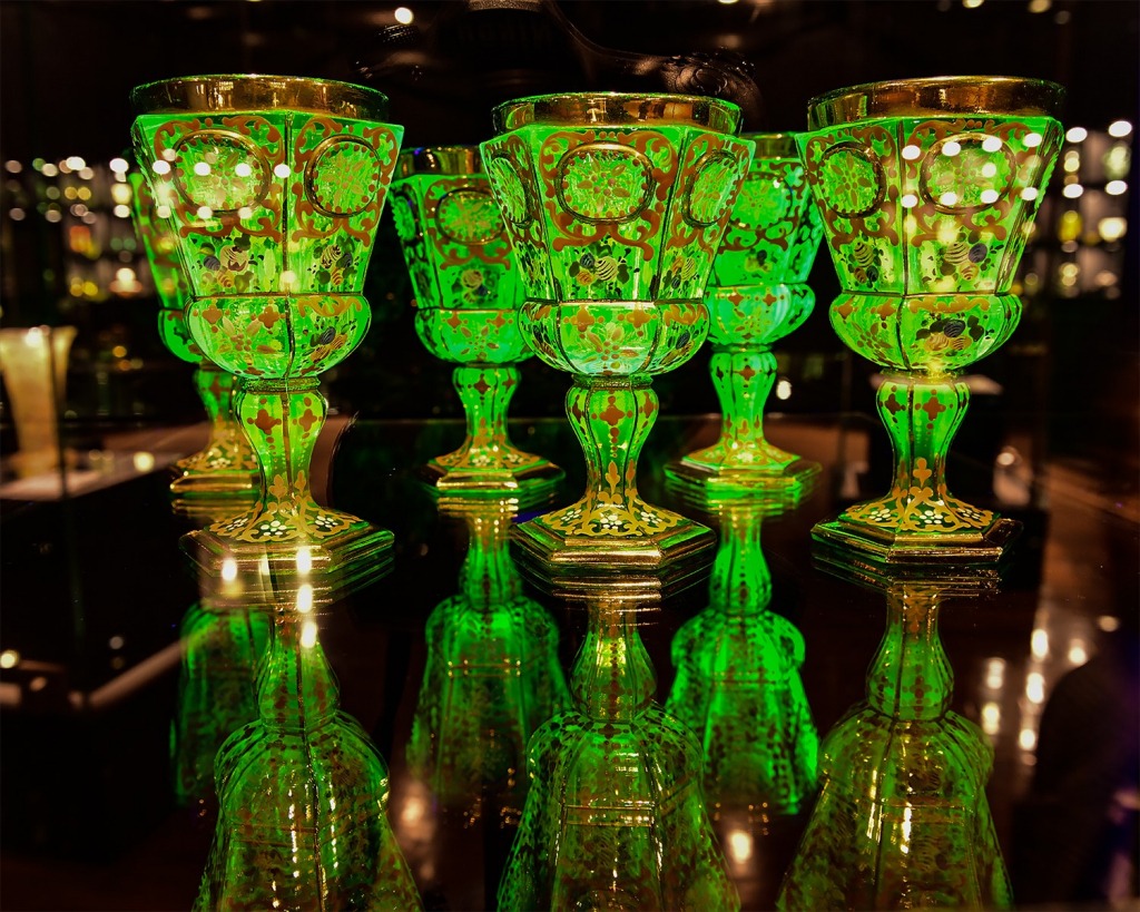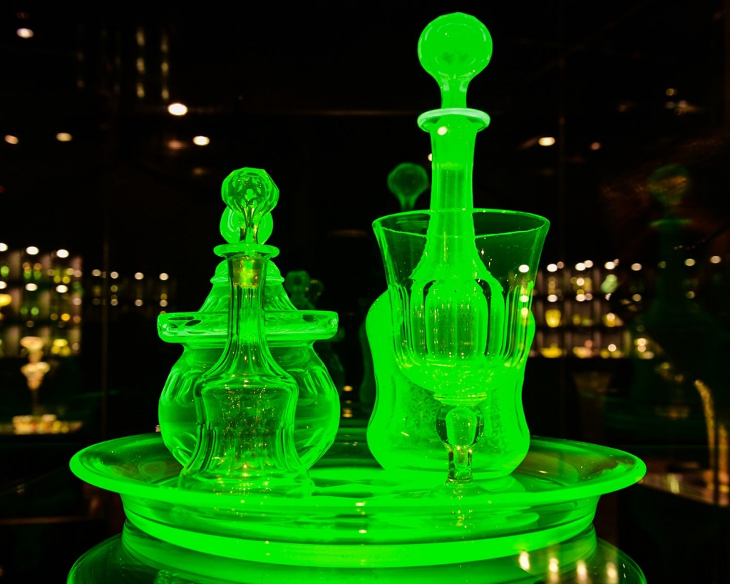 「ウランガラス」って、何だろうと思われる方が多いと思います。ウランガラス製品は、普通の光では薄い黄緑色に見えます。暗い場所で、ブラックライト(紫外線)の光をあてると魅惑的な緑色に見えます。