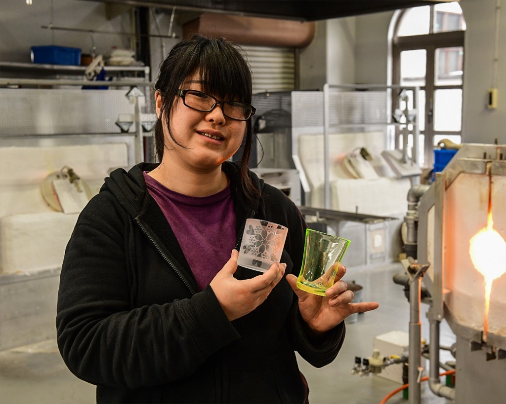 美術館に隣接する「ガラス工房」スタッフの谷口絢香さんにガラス制作過程を見せていただきました。