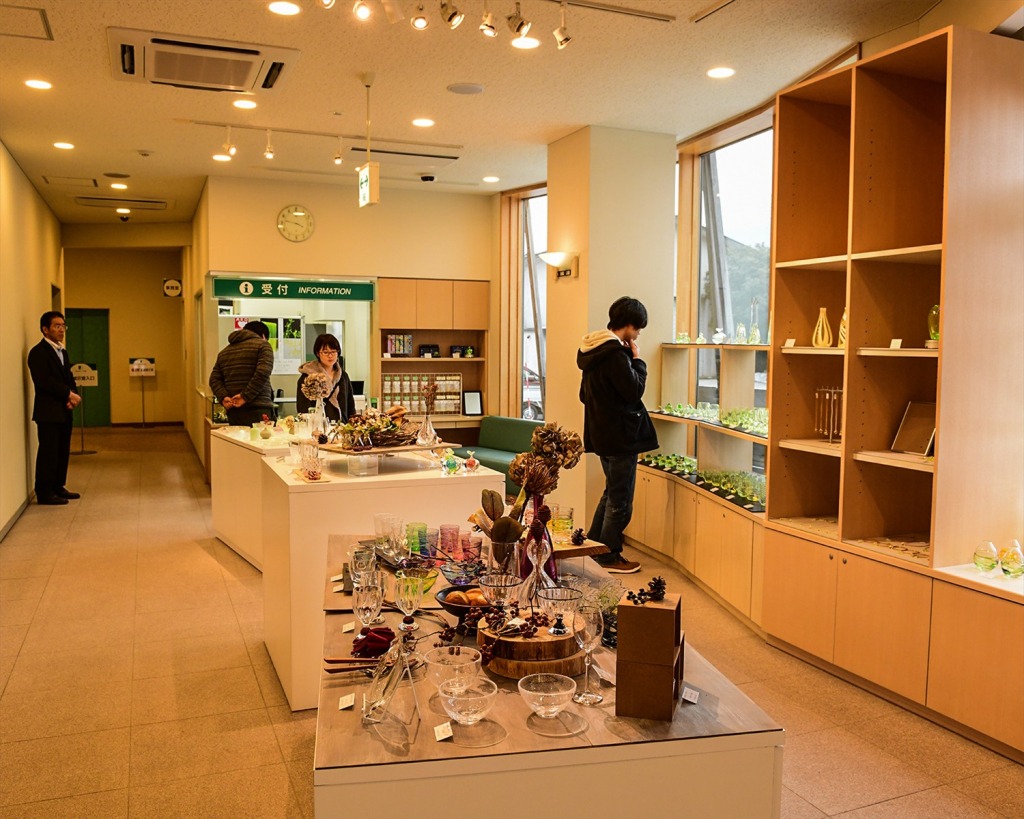 美術館ガラス工房で作られた「妖精の森ガラス」のグラス、アクセサリーなどのオリジナルグッズを中心に、国内外のガラス作家の作品、妖精グッズなどを販売しています。また、ブラックライトの安価なペンやウランガラスを上に置いて回転させるブラックライト回転台も販売されています。