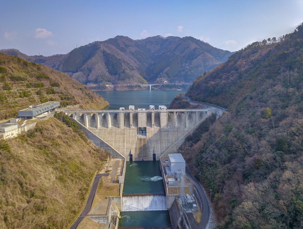 ドローンで、「苫田ダム下流公園」から撮影した苫田ダムの写真です。(国土交通省苫田ダム管理所の許可をいただいて撮影)