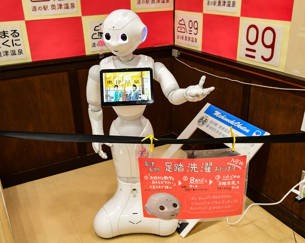 Pepperが、民謡「奥津温泉小唄」に合わせて、奥津名物「足踏み洗濯」を披露して、お客さんを楽しませてくれています。