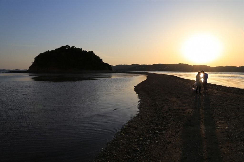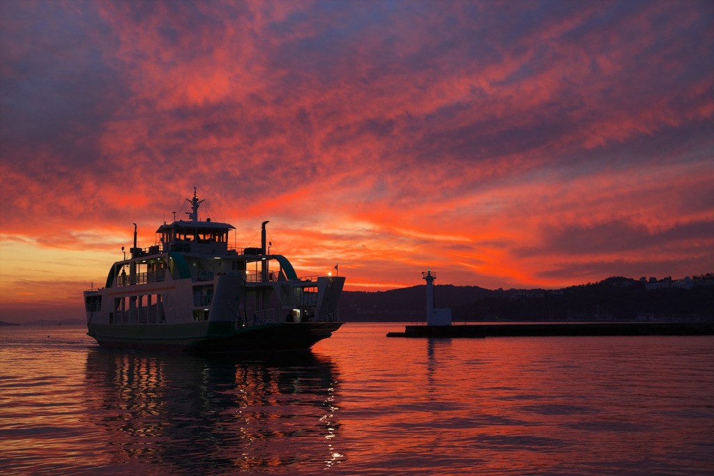 「日本の夕陽百選」にも選ばれた夕景スポット。前島へ向かうフェリーが旅情をかき立ててくれます。