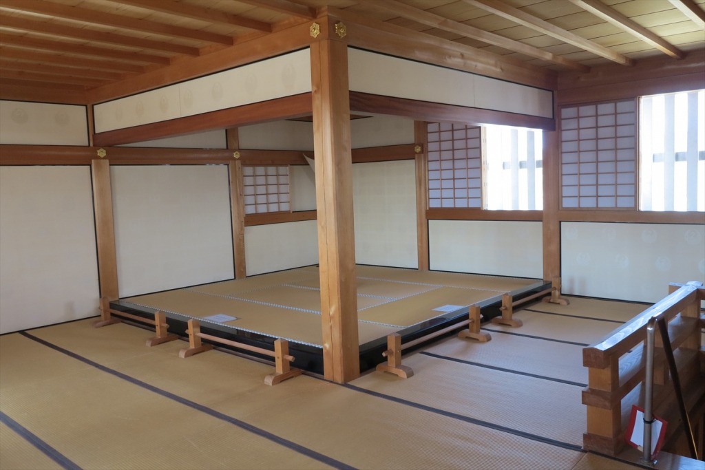 櫓でありながら日々の生活空間としても使われていたらしく、どの部屋にも畳が敷かれており、茶室も備えられています。壁紙はよーく見ると、美しい森家の鶴の家紋が…。勇ましさの中に優雅さを感じる、繊細なこだわりが伺えます。