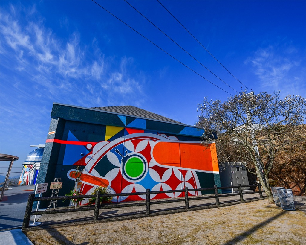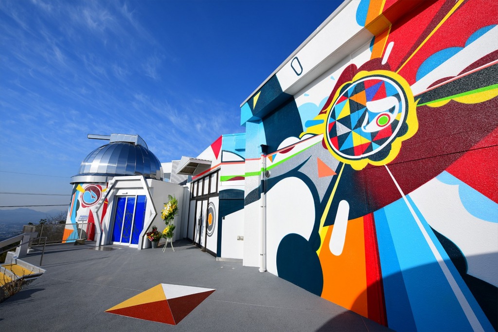 巨大な壁面にエネルギーを吹き込むアーティストたち -彼らを束ねる[THA]が今回、岡山県浅口市からオファーされたのは、岡山天文博物館の壁面です。