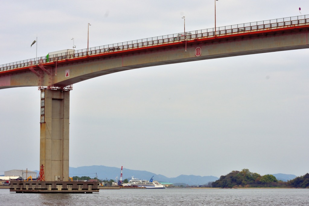 桁下空間の広さにびっくり、出港するフェリーもこのサイズ感!海上橋としては県下一の長さで、新岡山港方面からググっと上ると高低差にドキドキ。夜も銀河鉄道のようで素敵です。ドラマ「西部警察」では、なんと橋の上から身代金が投下されました。