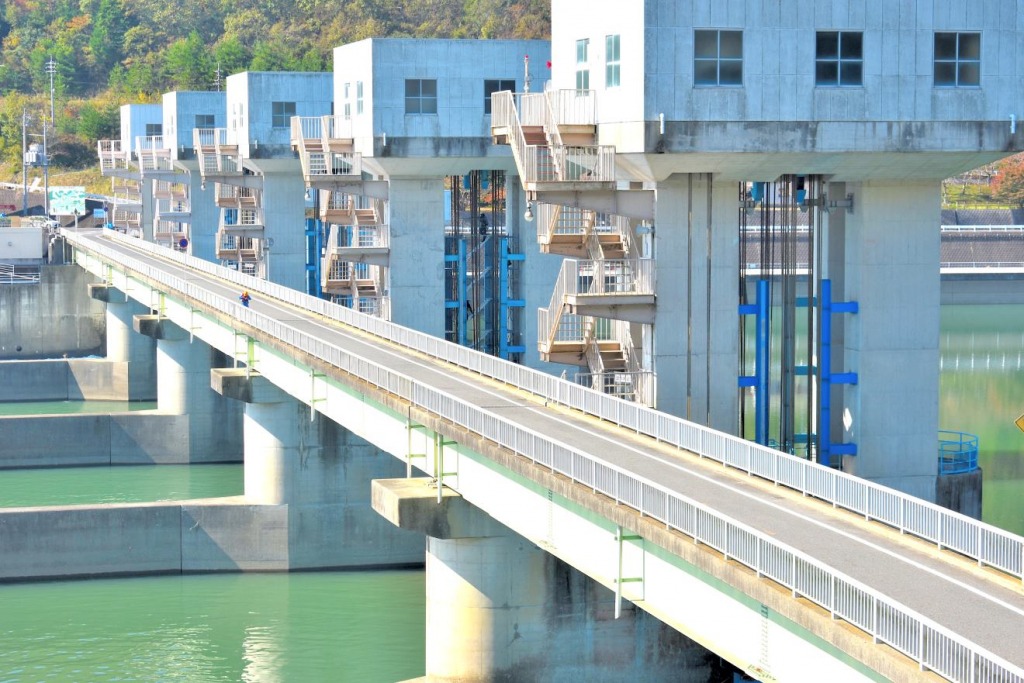 幾何学模様のような井堰を駆け抜ける車の小さいこと!吉井川の壮大さ、造形物としてのスケール感に息をのみます。井堰としての貯水量日本一を誇る、片鉄ロマン街道でも印象的なビュースポットです。