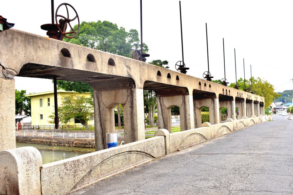 石造りのフォトジェニックな水門を間近に味わえる橋です。かわいい半円の模様など、丁寧な細工が施されています。溜川にせり出すように並ぶ家々とのコントラストもレトロ感満載。時代は変わっても遺ってほしい風景です。堪能したら、そのままドラム缶橋へ!