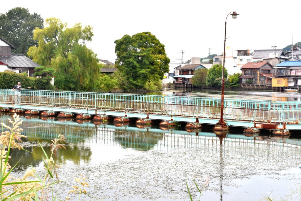 思わず渡りたくなる!100本超のドラム缶で浮いている橋です。シャッターを押さずにいられない、水際に色鮮やかに映る家屋群。心引き付けられるノスタルジックさが今、かえって新鮮なエリアです。