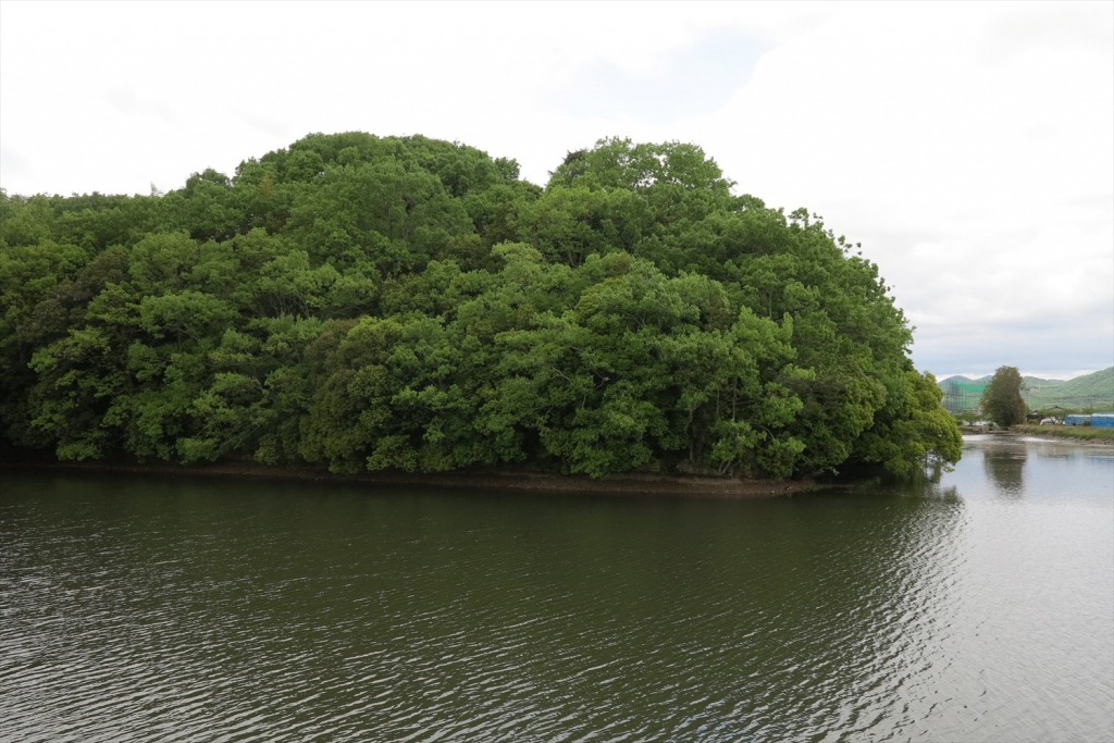 もこもこと木々が密集した、小さな島。近くで見るとそうとしか見えないこの場所こそが、国史跡に指定されている「両宮山(りょうぐうざん)古墳」なのです。