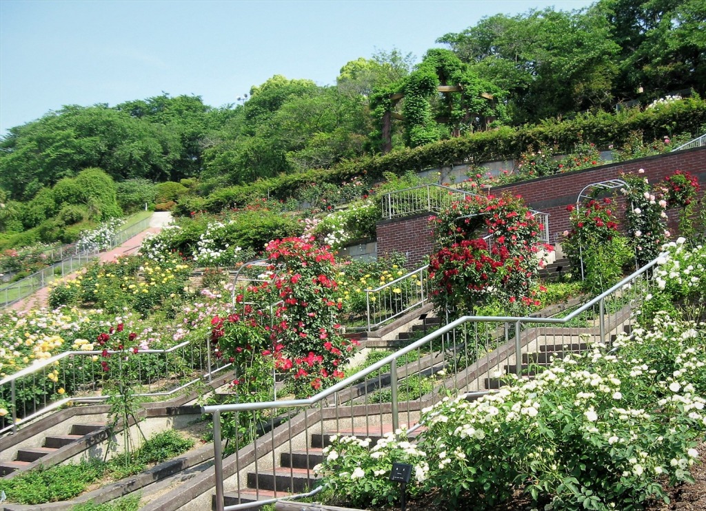 ハイブリット・ティーやフロリバンダ、イングリッシュローズなど、約250品種、1,000本のバラが見られる植物園です。正面玄関を入った先の傾斜地に植栽されているため、バラ園全体が見渡せます。2018年は生育が早く、5月上旬から中旬が見頃の予想です。