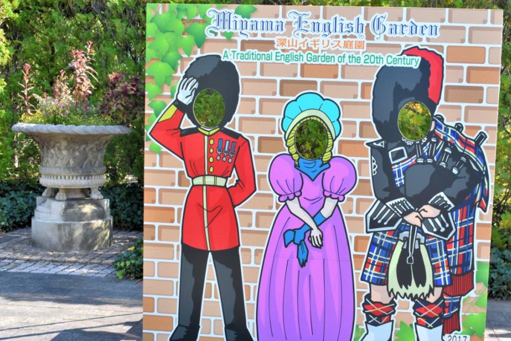 熊の毛皮の帽子、似合うかな?一瞬で近衛兵に早着替え!本格的なイギリス庭園を満喫した後のおたのしみにぜひ。毎年開催されるイギリスフェアでは、本物のバグパイプ奏者が目の前に現れます。