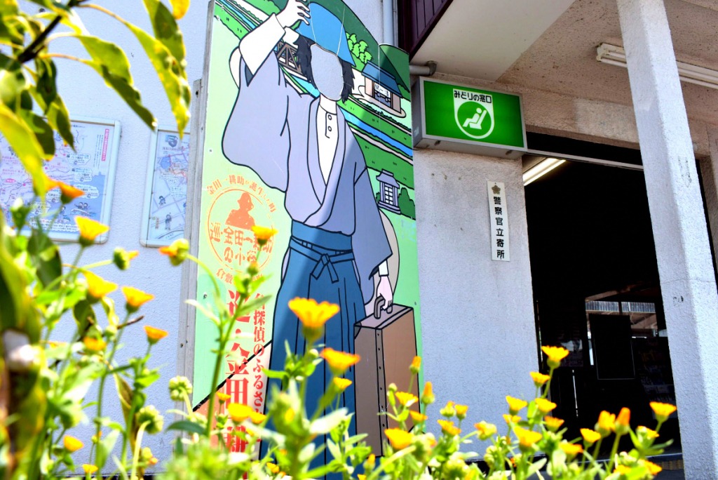密室事件の謎を解くため金田一耕助はある駅におりたった・・モデルとされる清音駅の顔出しパネル。なぜか顔が勝手にはまってしまう!?そんなミステリーも巻き起こりそうな名探偵の聖地です。江戸川乱歩も訪れた横溝正史の疎開宅など、歴史の現場もお見逃しなく。
