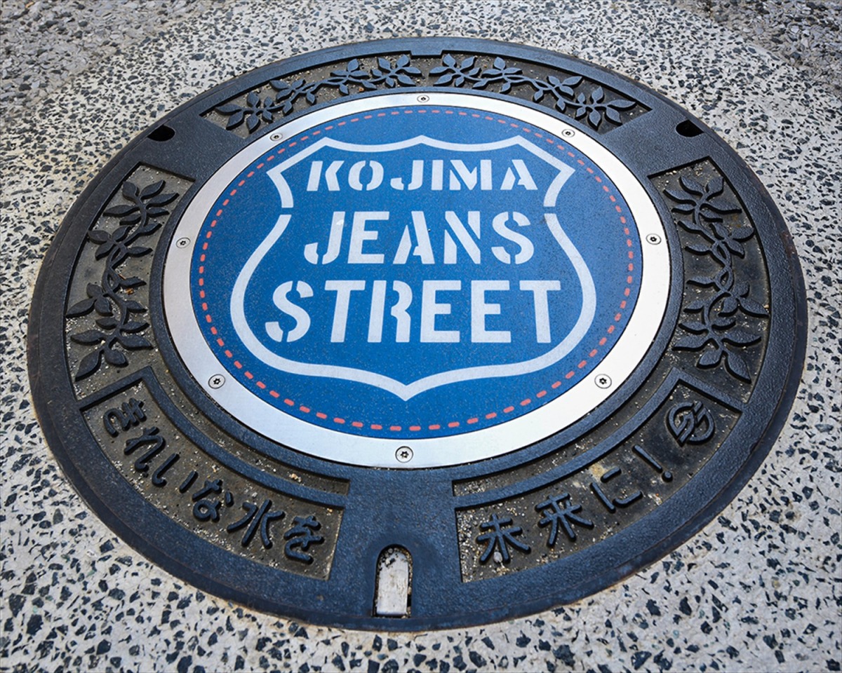 児島ジーンズストリートのロゴマークが入ったマンホールです。良い感じですね!