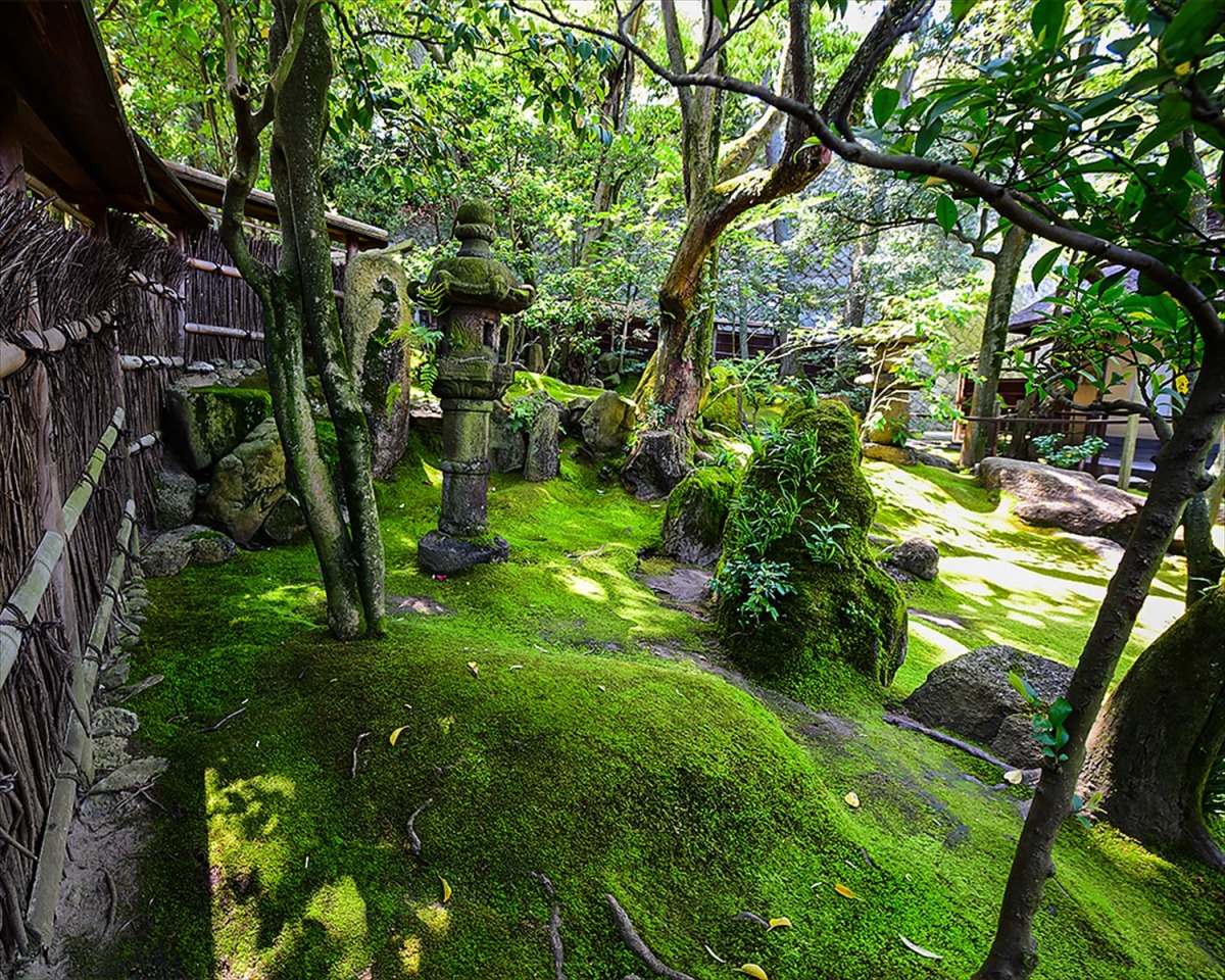 館内に入ると、風情のある水琴窟(すいきんくつ)の音が聞こえてきます。この写真では、左側の灯篭の右側に水琴窟があります。