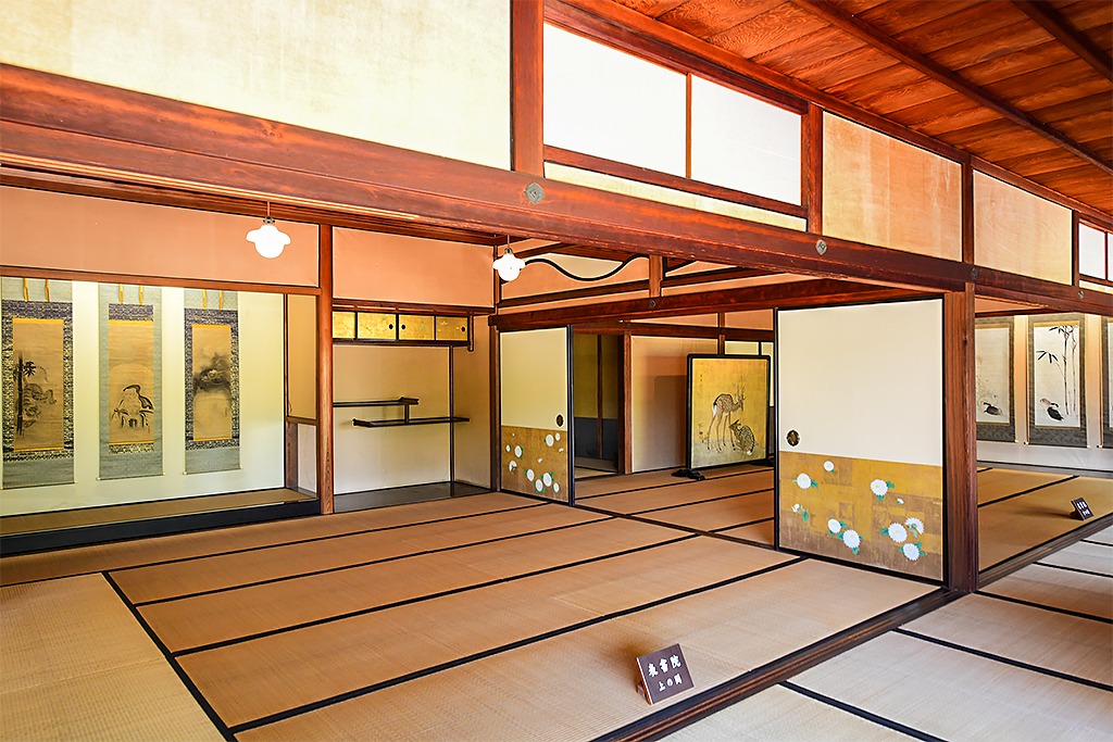 表書院の「上の間」と「下の間」の風景です。美しい掛け軸や襖絵(ふすまえ)をご覧いただけます。