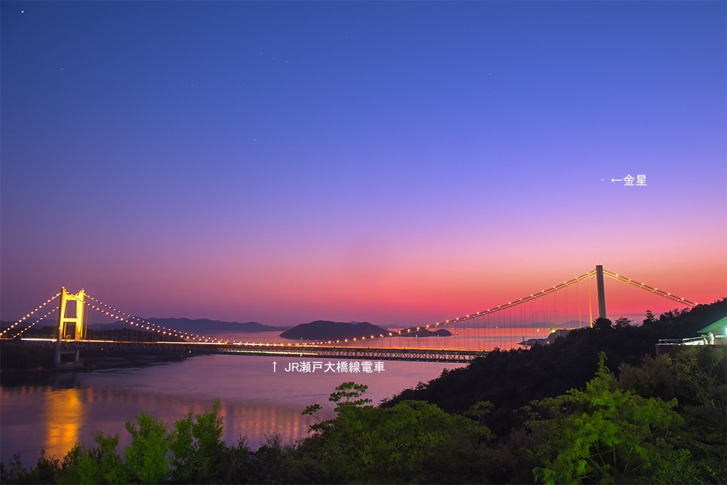 マジックアワー(ブルーモーメント)の時間帯は、空の色が美しく、大好きな時間です。宵の明星と言われる金星や星々が美しい風景の中にワンポイントになります。JR瀬戸大橋線の電車が光跡を残しながら、「ゴーッ!」と音をたてながら通り過ぎてゆきます。