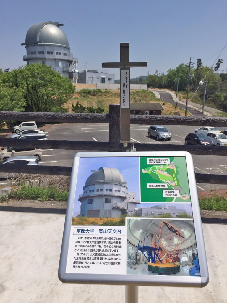 近くには、ピカピカの岡山天文台と記念撮影ができるスマホ置き場が設置されているので、セルフタイマー機能を使ってぜひ記念撮影を!