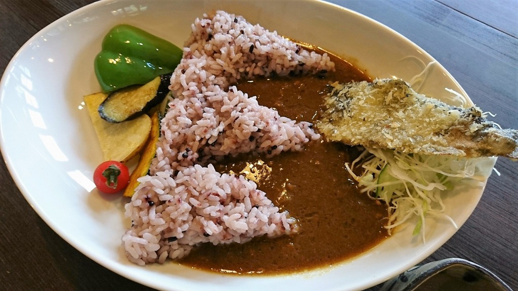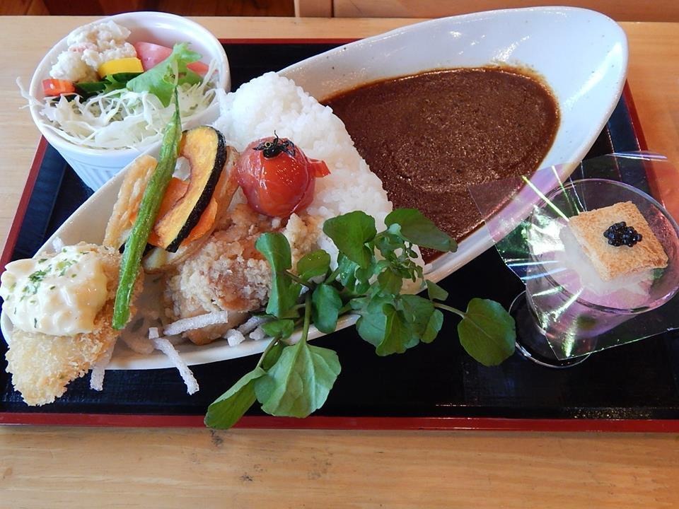 吉井川河口から約90km上流の鏡野町にある苫田ダム。このダムをモチーフにしたカレーに出会えるのが奥津温泉の日帰り入浴施設・花美人の里内にある「Aelu」。古代米の一種・紫黒米と自家栽培の米で、苫田ダムの特徴であるジグザグになったラビリンス式のダムを築き、ダムの下には山菜や野菜の素揚げで農地を表現。はちみつ入りのマイルドなカレールウが注がれたダム湖にはあまごのフライがトッピングされています。鏡野町特産の姫とうがらし味噌で辛さを調節できる、町の自然と恵みが存分に味わえるカレーです。