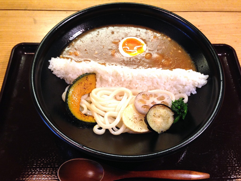 旭川の上流にあり、中四国最大のダム湖を擁する湯原ダム。そのダムの近くに建つ温泉旅館「八景」で食べられるのが、湯原ダム完成60周年にちなんで開発された「湯原温泉ダムカレー」です。ダム湖のカレールウは鶏のひき肉入り。ライスで作られたダムの反対側には素揚げのナスやレンコンなどで表現した露天風呂があり、うどんが添えられているのが特徴です。土・日・祝日を中心に提供されています。