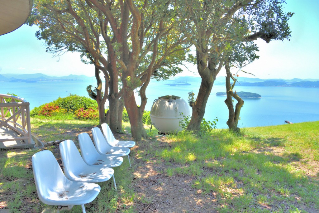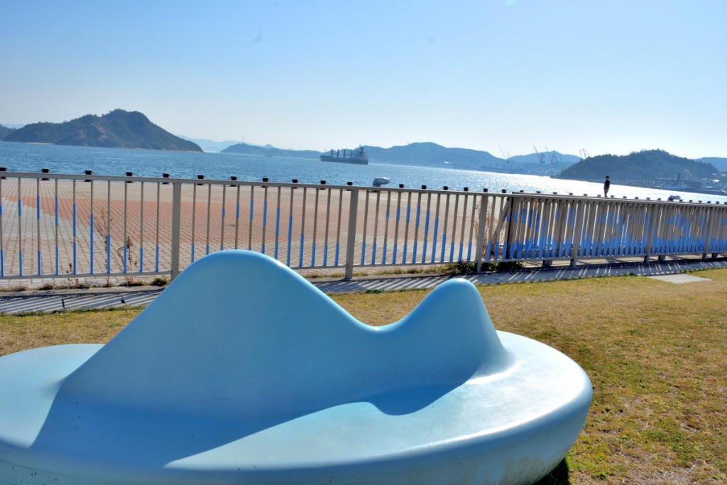 何だかほっとする様なつるんとしたイスが芝生広場に似合います。島々の間を大小様々な船が行き交う日常。マルシェや夏の花火。いつ訪れても安らげる場所です。