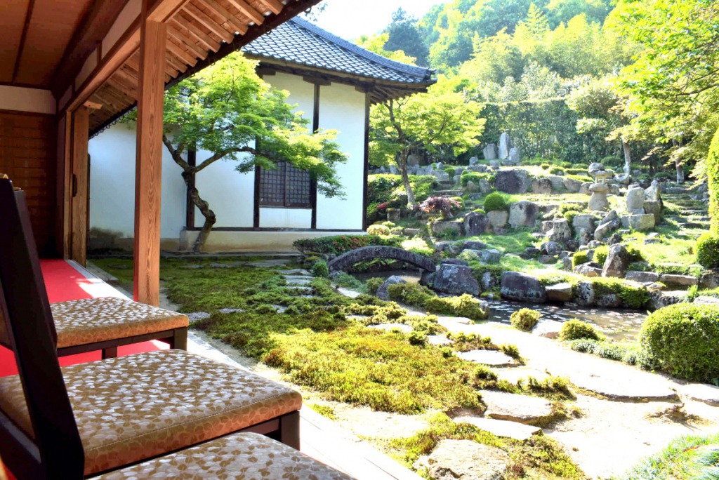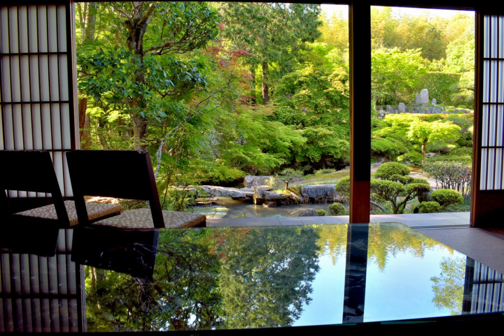 なんと心地よい躍動感と潔さ。景色のためイスにしばし座して、心ゆくまで景色を愛でましょう。そして白竜と黒竜、蓮の襖絵が見事な本堂を抜けて、この寺のもう一つの見どころ、西側の庭園へ。