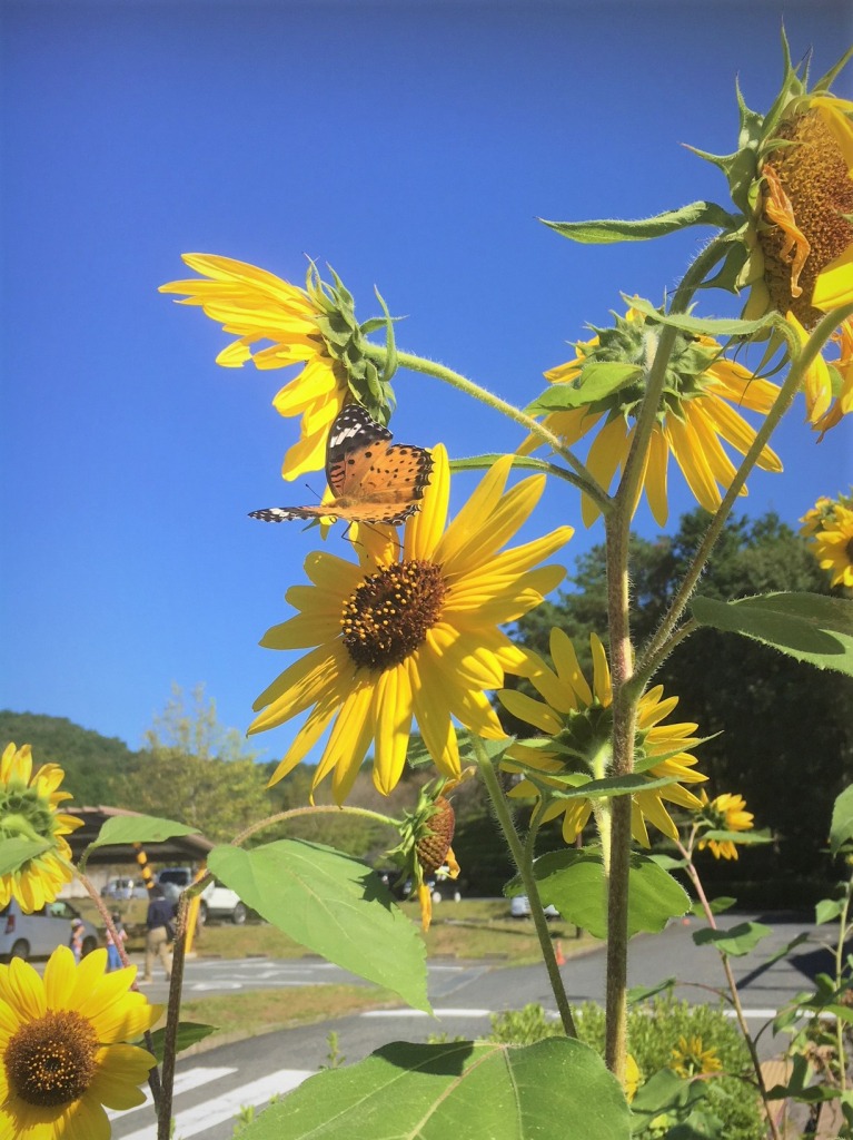1年を通して様々な花に彩られるノースヴィレッジの園内。7~8月にかけてはひまわりが開花して、青空の下、夏らしさを演出してくれます。