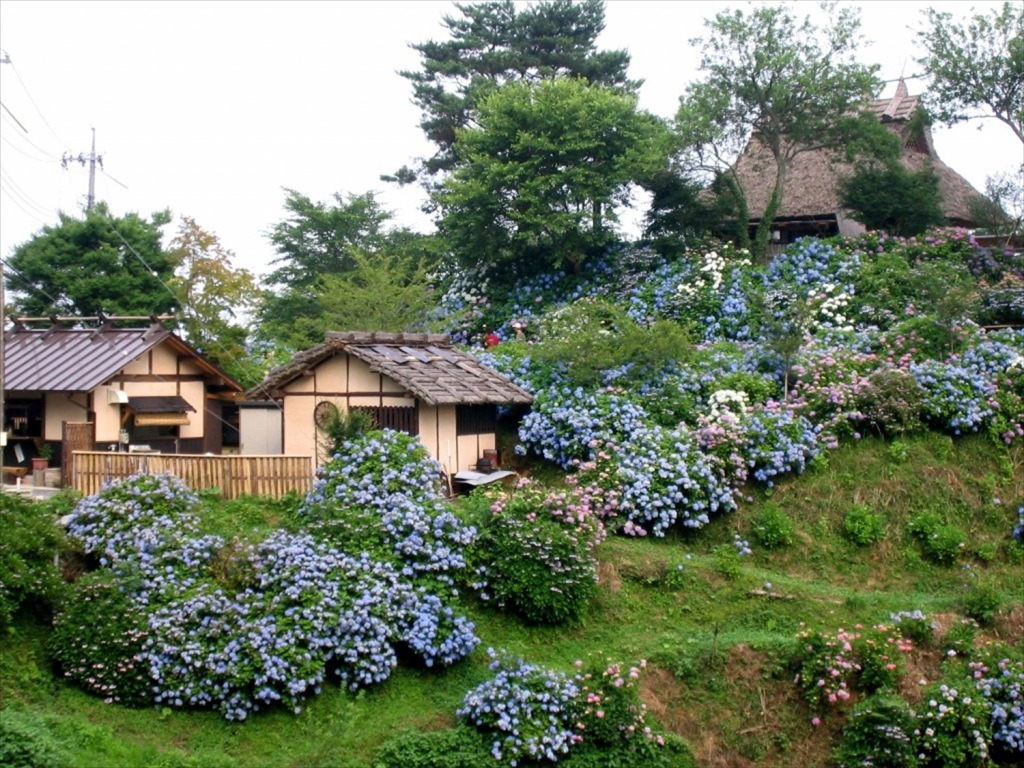 境内や周辺のかやぶき屋根の建物が約3,000株のあじさいに彩られ、情緒あふれる景色が広がっています。[見頃]6月中旬~下旬
