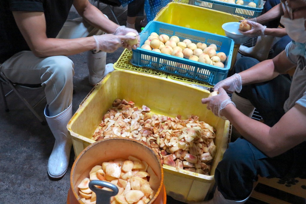 貴重でなかなか手に入らない清水白桃を100%使い、一つ一つ手作業で皮をむき、実を切っては焼酎に漬けていきます。桃は皮を剥くとすぐに変色してしまいますから、スピードが重要!