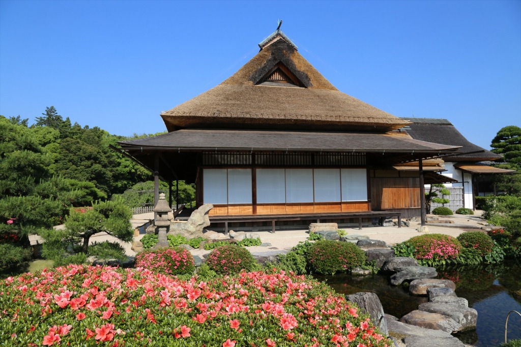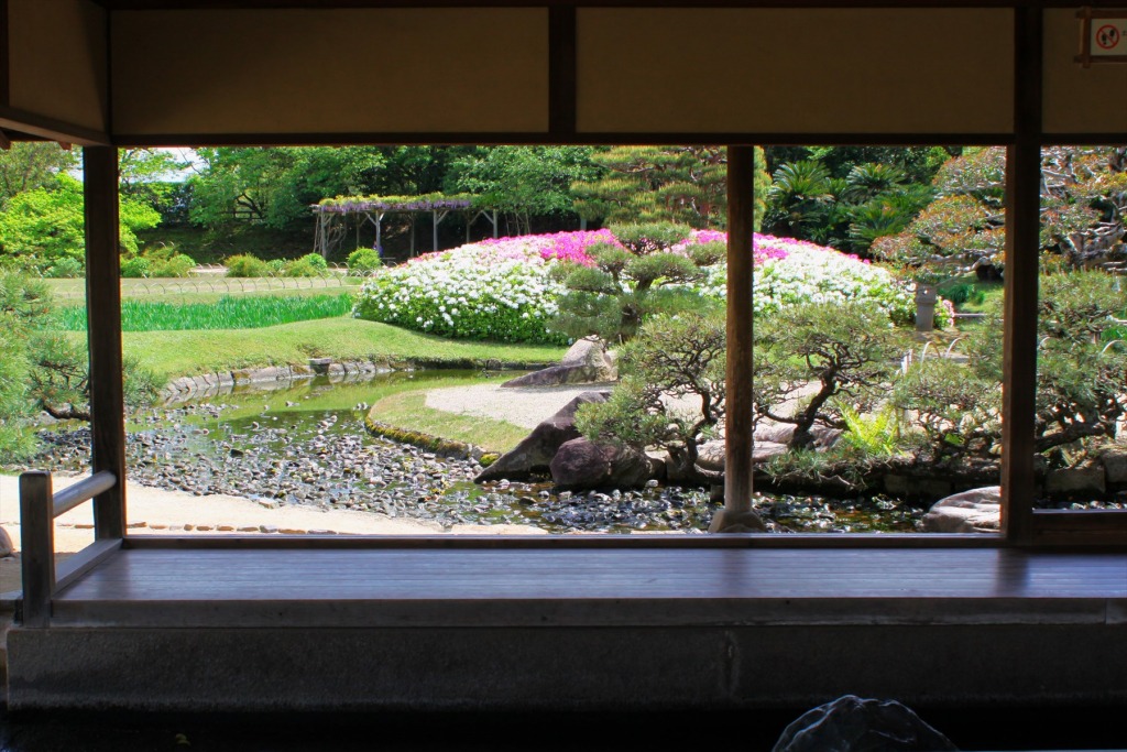 5月下旬から6月上旬にかけて朱色やピンクの花を咲かせるサツキ。延養亭や唯心山との組み合わせは岡山後楽園の代表的景観です。