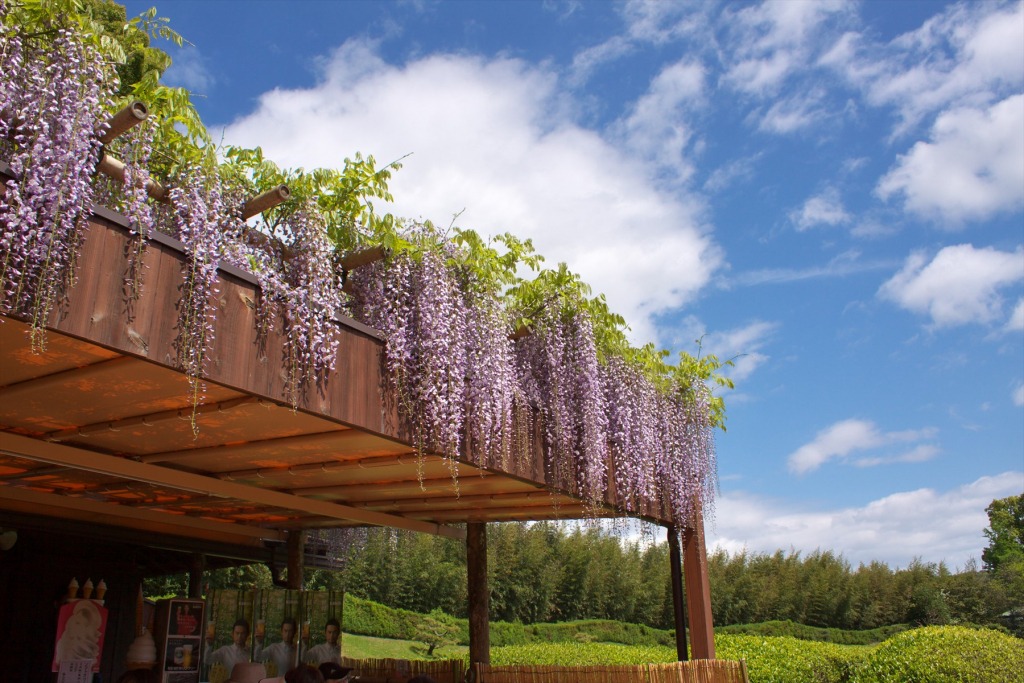 4月下旬~5月上旬にかけて藤の花が紫色の花を咲かせます。少し疲れたら、お抹茶ときび団子のセットなど和スイーツやソフトクリームでひと休み。