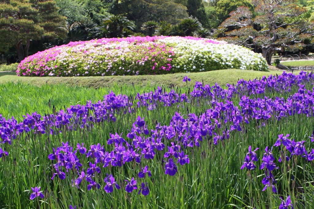 4月下旬から5月上旬にかけて、アヤメが濃紫色の花をつけます。ヒラドツツジの白やピンクの花との対比も楽しめます。