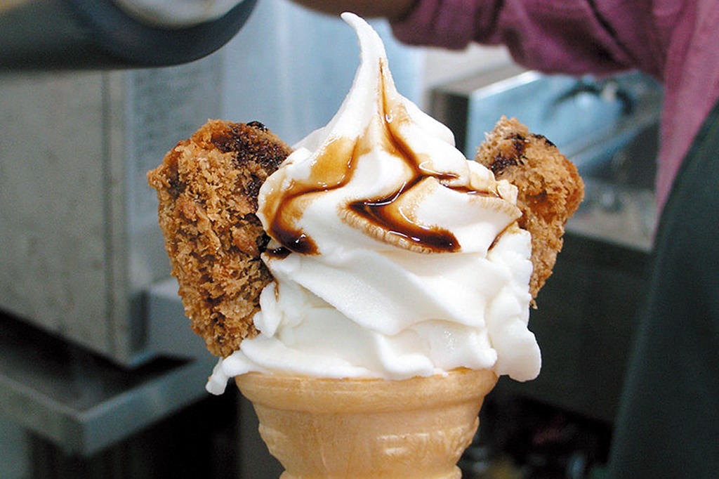 みたらし団子のタレ風の醤油ソースがかかったソフトクリーム。醤油の香りを保ちつつ、甘くてちょっぴりほろ苦い味わいが特徴。わさび添えのバリエーションもあり、どれも今までなかった新感覚!