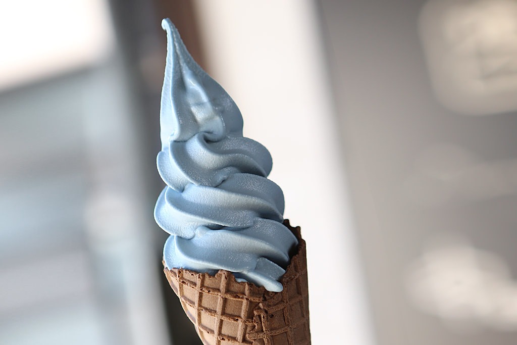 国産ジーンズ発祥の地である倉敷ならではのブルーなソフトクリームはラムネ味にブルーベリーが隠し味。ルックスとは裏腹に、正統派スイーツなんです♪
