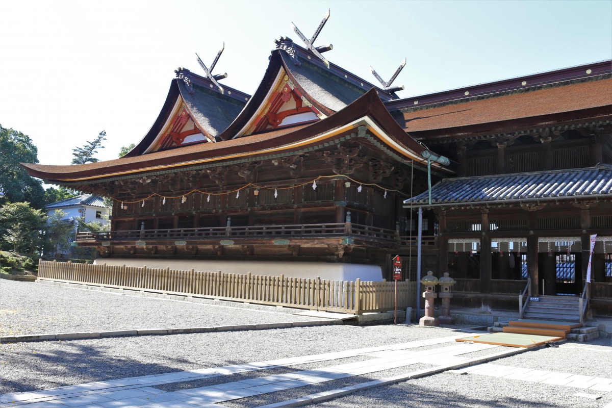 大吉備津彦大神を主祭神とする山陽道屈指の大社です。本殿は入母屋の千鳥破風を前後に二つ並べ、同じ高さの棟で結んでひとつの大きな屋根にまとめた国内唯一の構造で、比翼入母屋造(ひよくいりもやづくり)と呼ばれています。吉備津神社でしか見られないこの特殊な造りは、夫婦が仲睦まじく寄り添っている様子を表しているともいわれています。また、吉備津彦命の妻である百田弓矢比売(ももたゆみやひめ)が共に祀られていることから、縁結びや夫婦円満にご利益があるといわれています。