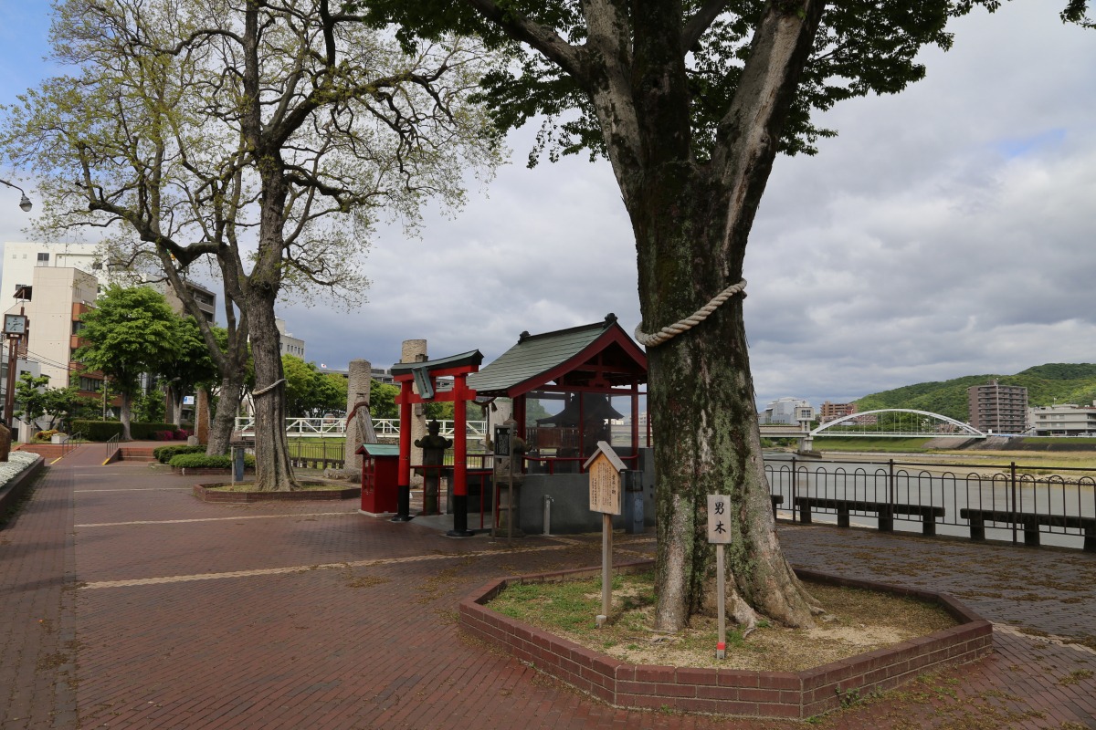 旭川沿い、京橋西詰の遊歩道に佇む稲荷神社です。恋愛や縁結びをつかさどる愛染明王がまつられており、知る人ぞ知る恋愛パワースポットになっています。社の両側に立つ大木は向かって右側が男木、左側が女木で、2本合わせて愛染の樹と呼ばれています。