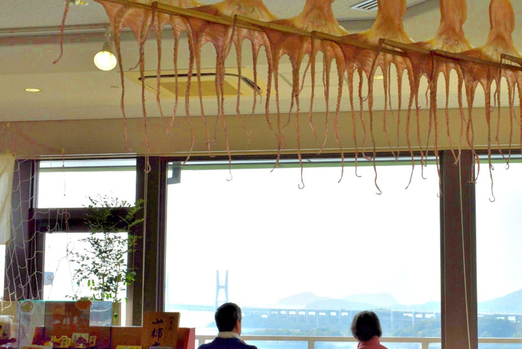 頭上にタコ!眼下に瀬戸大橋! 海町旅情を味わい尽くせる展望カフェは朝9時からオープン。リニューアルされた2階には無料の畳スペースやうれしい授乳室も完備です。