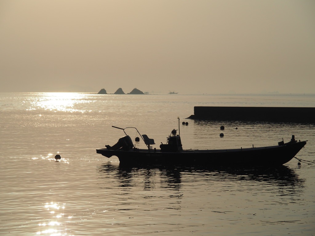 朝、きらめくさざ波の中、ポツンと浮かぶ「三ツ山」がいいアクセントになっています。