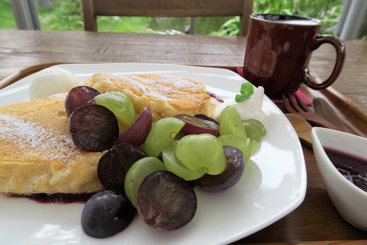 カフェ「スイーツパーラー十字屋商店」では、旬の素材や地元の食材にこだわったスイーツを楽しむことができます。「ゴロゴロぶどうのパンケーキ」は、今が旬のピオーネと瀬戸ジャイアンツがあふれんばかり!こちらは期間限定なくなり次第終了ですよ~!