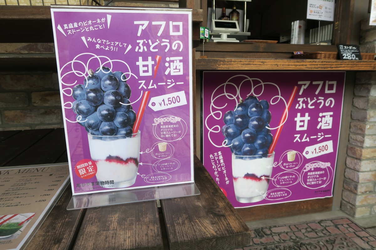「アフロぶどうの甘酒スムージー」は、ドドンと乗ったピオーネ丸ごと!みんなでワイワイとシェアしながら食べるもよし!インスタ映え間違いなしですね。