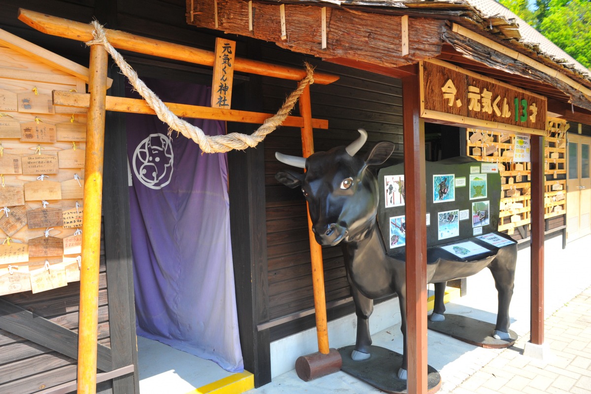 1998年の洪水で津山市から牛窓沖まで流されたにも関わらず生還を果たした奇跡の牛「元気くん」の奇跡を讃えて造られた、おかやまファーマーズ・マーケット・ノースヴィレッジ内にある神社です。絵馬(牛?)に願い事を書いて、元気くん神社にお参りすると願い事が叶うとか…。