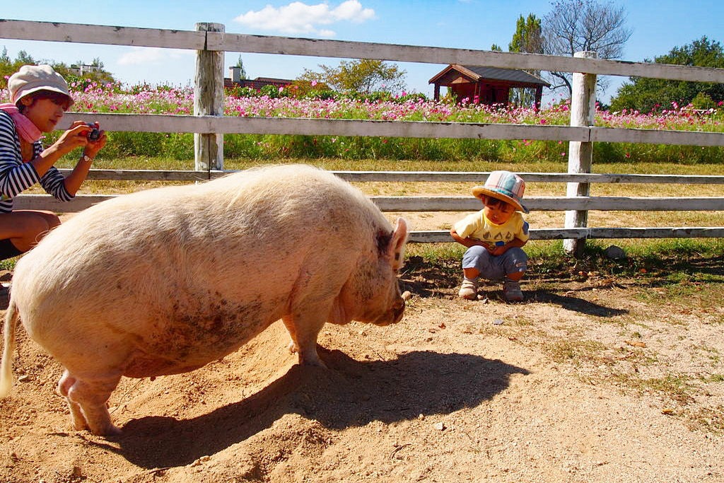 放牧場では牧羊犬の羊追いや羊の毛刈りショーが開催されたり、ふれあい広場ではミニブタ・ウサギ・モルモット・アルパカ・ポニー・カンガルーなど色んな動物たちと触れあったりできます。園内に咲く四季折々の美しい花々を愛でながら、美味しい自家製ソーセージも!