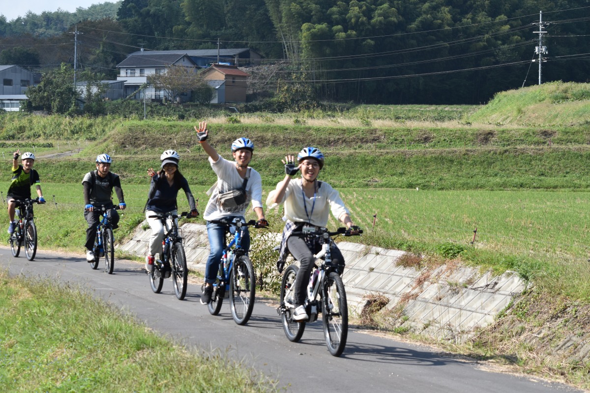 自転車を使った散歩的サイクリングが「ポタリング」。ただ走るだけでなく、途中立ち寄った先の農家で野菜等の収穫をしたり、ヒノキの森の中で森林浴をしながら地元のお母さんが作ったご飯を食べたりするオリジナルツアーを実施しています。